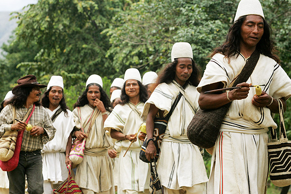 are indigenous people of Colombia. They are Chibchan-speaking people and descendants of the Tairona culture, concentrated in northern Colombia in the Sierra Nevada de Santa Marta. They are also known as the Aruaco, Bintucua, Bintuk, Bíntukua, Ica, Ijca, Ijka, Ika, and Ike people. The Arhuacos live in the upper valleys of the Piedras River, San Sebastian River, Chichicua River, Ariguani River, and Guatapuri River, in an indigenous territory in the Sierra Nevada de Santa Marta Mountains. Their traditional territory before the Spanish colonization, was larger than today’s boundaries which exclude many of their sacred sites that they continue to visit today, to pay offerings. These lost territories are the lower parts by the steps of the mountains, lost to colonization and farming. (Source: Wikipedia; Photo by Kelly Tatiana Paloma)